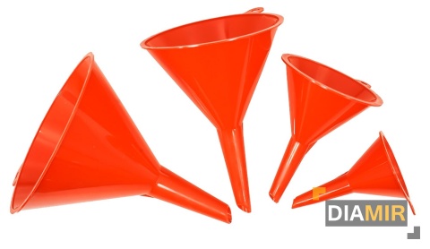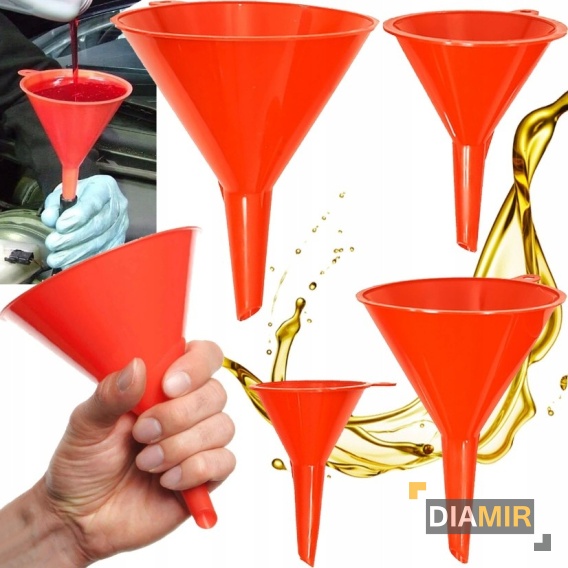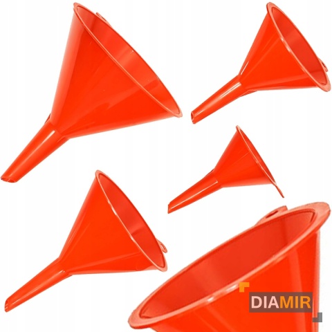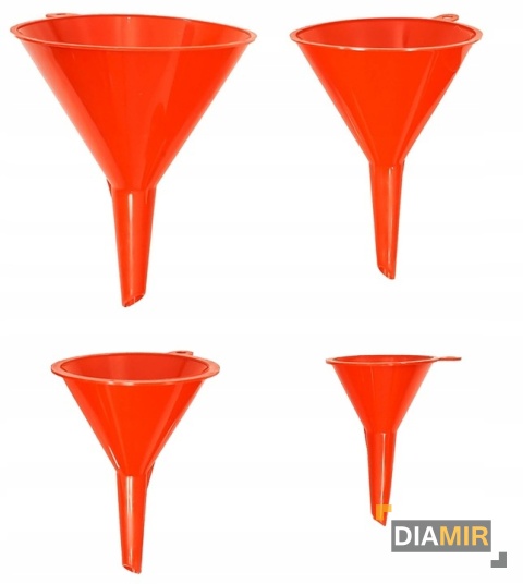Zestaw 4 uniwersalnych lejków z tworzywa sztucznego o różnych średnicach (52, 75, 95, 115 mm). Przydatny w domu, garażu i warsztacie.