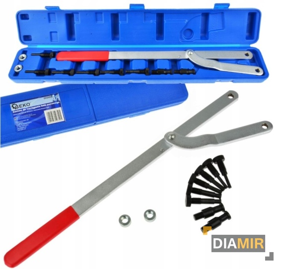Uniwersalny klucz do blokowania i obracania kół pasowych – zestaw 11 elementów. Idealny do pracy przy rozrządzie i naprawach silnika.