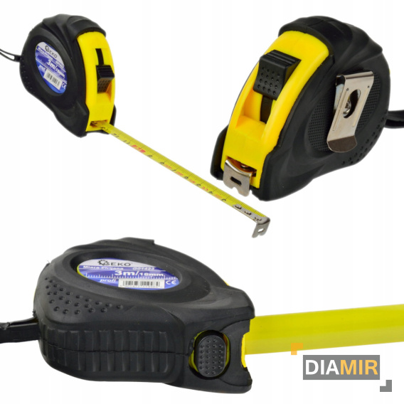 Taśmę ze stali węglowej zakończono solidnym zaczepem mierniczym. Obudowa miarki zrobiona z tworzywa sztucznego typu ABS z gumową osłoną. Gładka i czytelna podziałka ułatwia odczyt pomiaru. Przycisk blokady obsługiwany kciukiem. Dodatkowy przycisk blokady na spodzie miary.