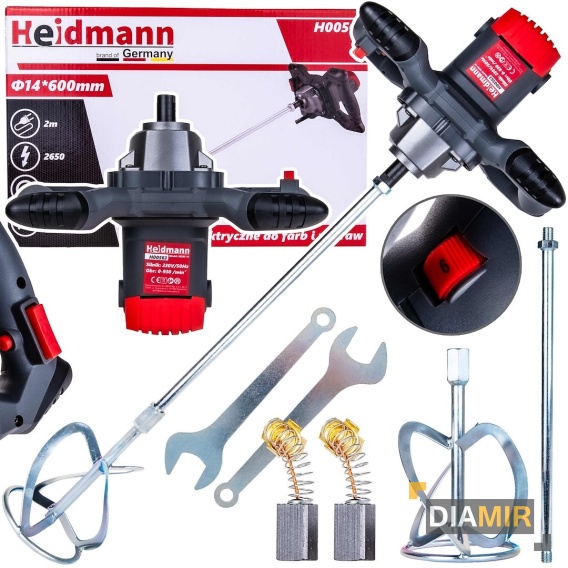 Mieszadło elektryczne Heidmann 2650W to wysokowydajne narzędzie przeznaczone do mieszania materiałów budowlanych, takich jak zaprawy, kleje, tynki, farby czy gładzie. Wyposażone w mocny silnik o mocy 2650W, regulację obrotów oraz standardowy gwint M14, mieszadło jest wszechstronnym rozwiązaniem zarówno dla profesjonalistów, jak i domowych majsterkowiczów.