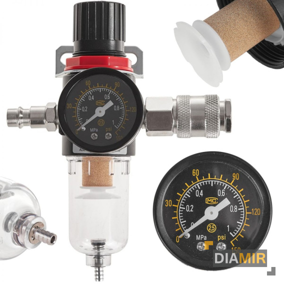 Odwadniacz z filtrem powietrza oraz reduktorem wyposażony w standardowe przyłącze powietrza 1/4”. Urządzenie przeznaczone do oczyszczania powietrza dopływowego z większości płynnych i stałych cząstek. Posiada regulator ciśnienia który pozwala na płynną regulację ciśnienia powietrza wylotowego w zakresie od 0 do 150 PSI.