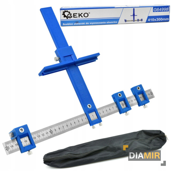Szablon stolarski z prowadnicą, przeznaczony do wykonywania precyzyjnych otworów w drewnie, płytach MDF, płytach wiórowych, tworzywach sztucznych oraz metalu. Wyposażony w dwie prowadnice, prowadnica wykonana z wysokiej jakości tworzywa używana jest do ustalenia odległości otworów od krawędzi obrabianego elementu, prowadnica aluminiowa natomiast przeznaczona jest precyzyjnego ustalenia rozstawu otworów.
