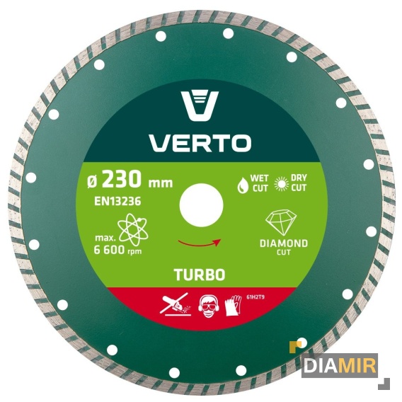 Tarcza diamentowa turbo VERTO (nr ref. 61H2T9) o średnicy zewnętrznej 230 mm pozwala wydajnie ciąć elementy wykonane z betonu, betonu zbrojonego, granitu, marmuru, kamienia, cegły itp. Marka VERTO oferuje asortyment elektronarzędzi i akcesoriów dla każdego majsterkowicza.