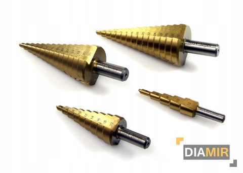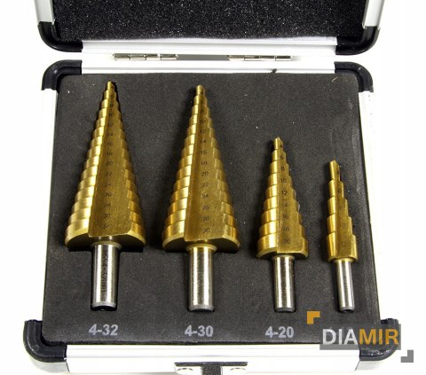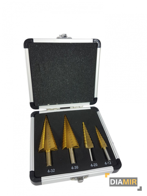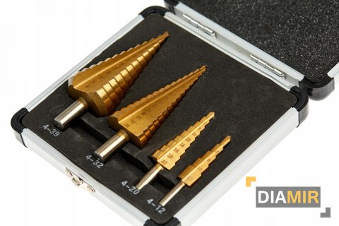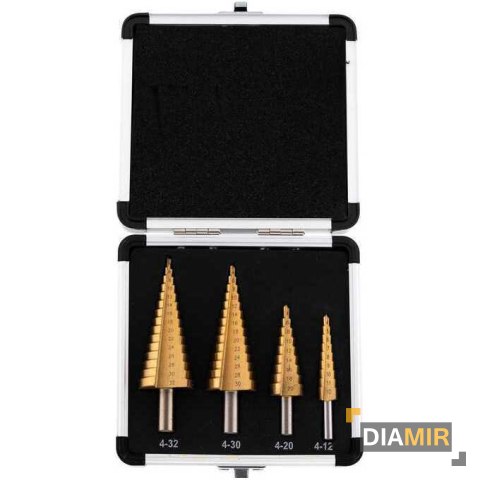 Wysokiej jakości zestaw czterech wierteł stopniowych w praktycznej metalowej walizce. Wykonane z wysokogatunkowej stali HSS. Przeznaczone do wiercenia w metalu, blachach, tworzywach sztucznych itp.