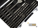 • 12 wierteł: 5x110, 6x110, 8x110, 10x110, 6x160, 8x160, 10x160, 12x160, 8x210, 10x210, 12x260, 14x260 mm