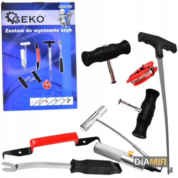Prezentowany zestaw służy do profesjonalnego demontażu szyb samochodowych. Może posłużyć do wycinania szyb. Składa się z siedmiu elementów.