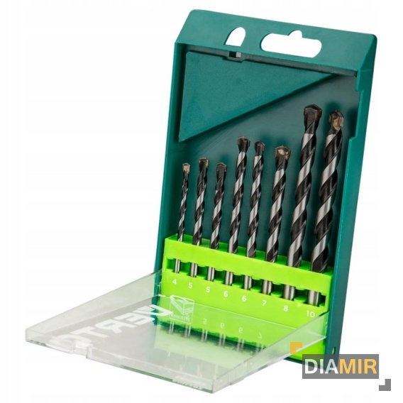 Wiertła do betonu VERTO (nr ref. 60H302), zestaw 8 szt. o rozmiarach od 4 do 10 mm, posiadających końcówkę widiową z drobnoziarnistego węglika spiekanego o zwiększonej odporności na wysoką temperaturę. Szlifowana spirala wierteł zmniejsza opory wiercenia.