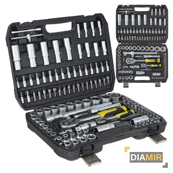 Zestaw 108-elementowy kluczy nasadowych i bitów. Całość narzędzi wykonano ze stali chromowo-wanadowej.