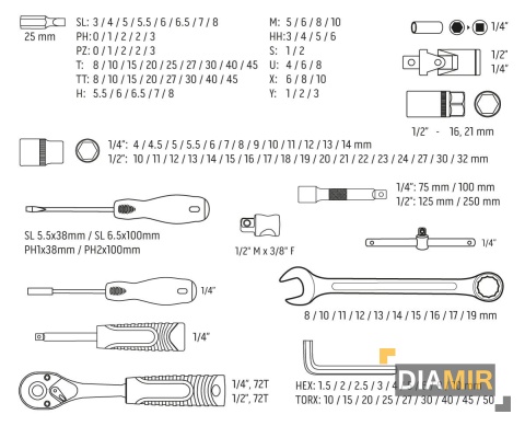Nasadka w zestawie: 1/4" rozmiary: 4, 4.5, 5, 5.5, 6, 7, 8, 9, 10, 11, 12, 13, 14