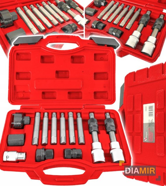 Profesjonalny zestaw kluczy do montażu i demontażu alternatorów typ Bosch i Magneti Marelli. Dostosowany do samochodów marek: Audi, BMW, Fiat, Ford, Mercedes, Opel, Renault, Peugeot, Seat, Skoda, Volvo, VW i innych. Klucze umożliwiają jednoczesne odkręcanie śruby mocującej koło pasowe (za pomocą odpowiedniego bitu) oraz przytrzymywanie koła ze sprzęgłem (za pomocą specjalistycznej nasadki).