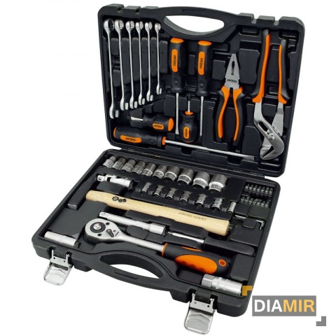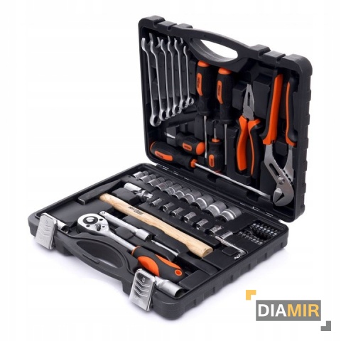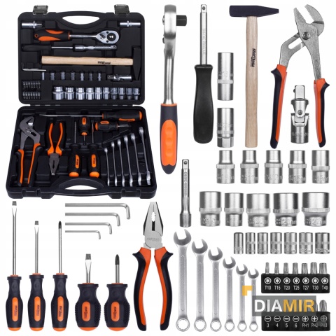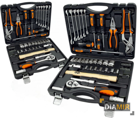 klucze płaskie, nasadowe, grzechotkę, zestaw szczypiec, zaciski, imbusy, nóż, a także wkrętaki i końcówki do bitów.