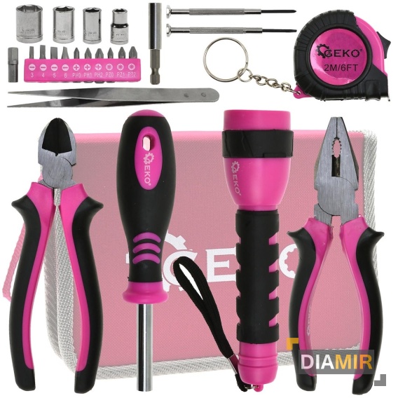 Narzędzia w kolorze różowym, dzięki czemu spodobają się każdej kobiecie. W skład zestawu wchodzą najpotrzebniejsze narzędzia, takie jak: kombinerki, obcinaczki boczne, wkrętak z wymiennymi bitami, wkrętak precyzyjny płaski i krzyżowy, uchwyt do bitów z adapterem do nasadek 1”, zestaw nasadek, latarka, miara 2m, pęseta. Wszystkie narzędzia z zestawu wykonane zostały z wysokiej jakości stali narzędziowej CrV oraz umieszczone w poręcznym zasuwanym etui.